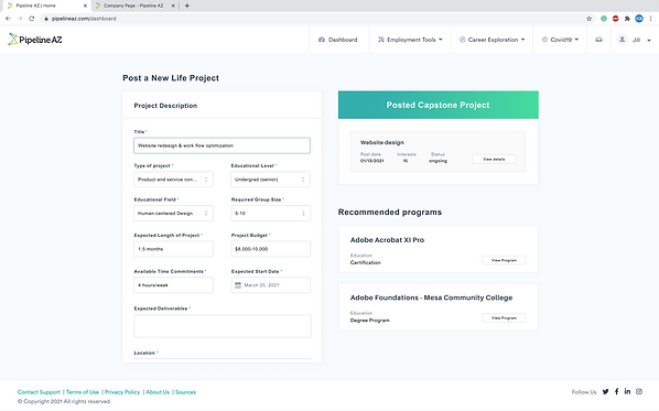 Pipeline AZ is a career development and exploration tool designed for the Arizona community to create more pathways to in-demand careers founded by PEI. To help PEI design services for work-based learning experiences of secondary and college students in Phoenix, AZ, our team created a new section called “Life Project” under Career Exploration on the Pipeline AZ website. This platform will help startups collaborate with universities through some life/capstone projects.